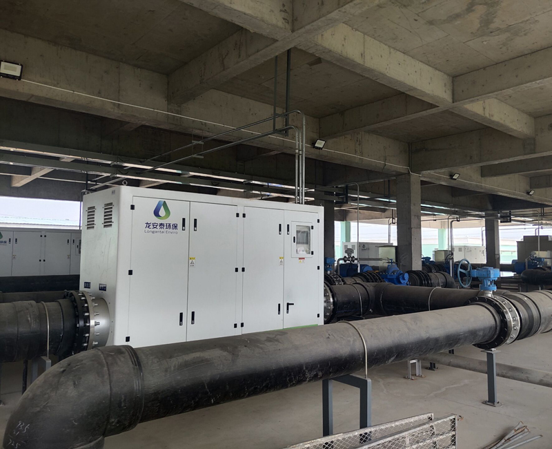項目概述:天津某電廠利用垃圾燃燒的熱量發電。電廠共有兩臺發電機組,配備兩套循環水系統,循環水量分別為2000m3/h和4000m3/h,兩臺機組的凝汽器材質均為不銹鋼,空冷器、油冷器均為銅材質,配備龍安泰環保2套電化學設備及相關配套設施。經過長時間的穩定運行,循環水處理效果良好,阻垢、緩蝕效果顯著。循環水水質:循環水補水為污水廠中水,循環水系統結垢、腐蝕情況的控制難度大,綠藻滋生嚴重。循環水量:6